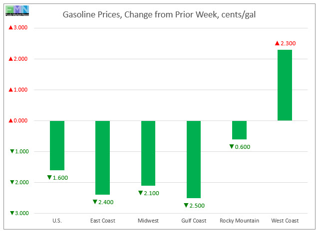 In the Gulf Coast PADD 3 market, gasoline prices fell by 2.5 cents to average $2.257/gallon. This was the largest price drop among the PADDs. PADD 3 continues to have the lowest average prices among the PADDs, currently 37.2 cents/gallon below the average U.S. price. Prices for the week were 37.0 cents lower than for the same week last year.