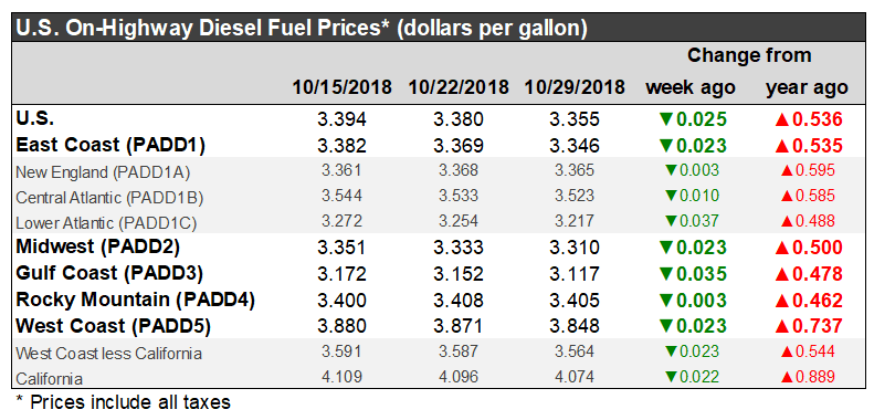 The U.S. Energy Information Administration (EIA) released its weekly data on diesel and gasoline retail prices for the week ended October 29, 2018. Retail prices for both fuels fell in all PADDs countrywide. On a national average basis, gasoline prices dropped by 3.0 cents/gallon, while diesel prices fell by 2.5 cents/gallon.