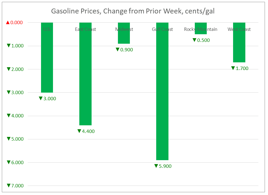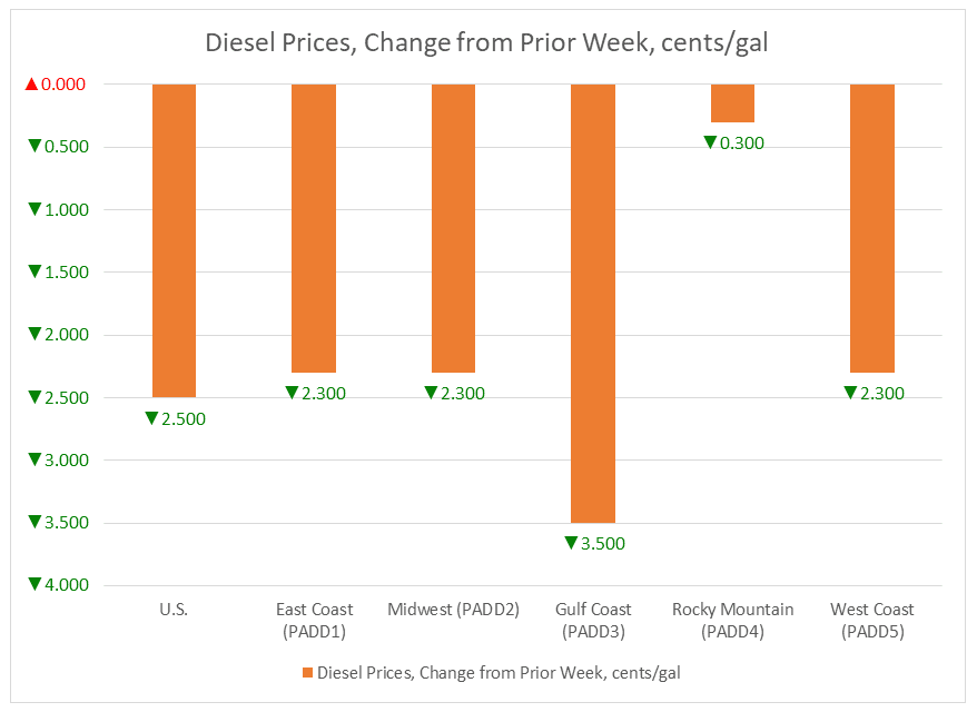 In the Gulf Coast PADD 3, retail diesel prices dropped by 3.5 cents to average $3.117/gallon. This was the largest price decrease among the five PADDs. Prices were 47.8 cents higher than for the same week in the previous year.