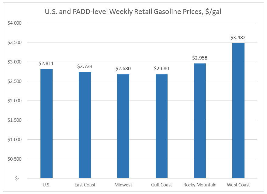 In the West Coast PADD 5 market, retail gasoline prices fell by 1.7 cents to arrive at an average of $3.482/gallon. This price was 55.4 cents higher than at the same time a year ago. PADD 5 continues to have the highest gasoline prices among the five PADDs. Excluding California, West Coast prices decreased by 1.0 cent to average $3.231/gallon. This was 54.3 cents higher than at the same time in 2017. In California, pump prices dropped by 2.6 cents to average $3.683/gallon. California prices were 61.7 cents per gallon above their levels from last year.