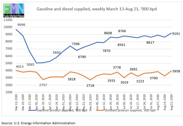 The EIA publishes weekly “product supplied” data as its proxy for demand. These data show gasoline demand crashing from 9,696 barrels per day (kbpd) during the week ended March 13 to just 5,065 kbpd during the week ended April 3, a huge hit of 4,631 kbpd in just four weeks. That was the low point. Demand thereafter trended generally up until it reached 8,608 kbpd during the week ended June 19. Since then, demand has cycled up and down. Apparent demand recovered to 8,809 kbpd during the week ended July 24, retreated to 8,617 kbpd during the week ended July 31, and jumped to 9,161 kbpd during the most recent week ended August 21. The EIA points out that “product supplied” is not a precise measure of demand, but these data provide the most up-to-date numbers publicly available.