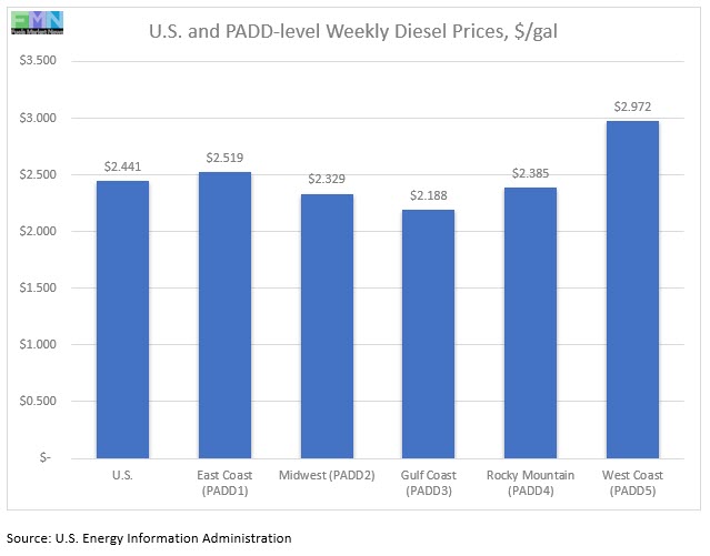 Diesel prices also had been above last year’s level, but prices are now well below these levels. On a national basis, the retail price for diesel averaged $2.441/gallon—53.5 cents/gallon lower than the price in the same week last year.