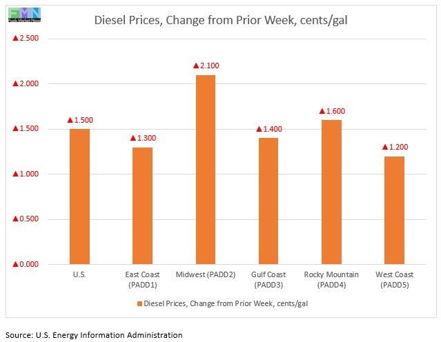 In the Rocky Mountains PADD 4 market, retail diesel prices rose by 1.6 cents to average $2.385/gallon. PADD 4 prices were 53.9 cents lower than for the same week in the prior year.