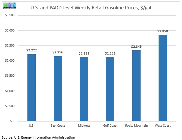 In the Midwest PADD 2 market, retail gasoline prices rose by 4.8 cents to average $2.121/gallon. PADD 2 prices for the week were 34.3 cents/gallon lower than they were for the same week last year.