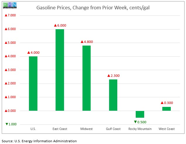 For the week ended August 31, retail prices for gasoline rose by 4.0 cents/gallon. Retail prices for diesel rose by 1.5 cents/gallon.