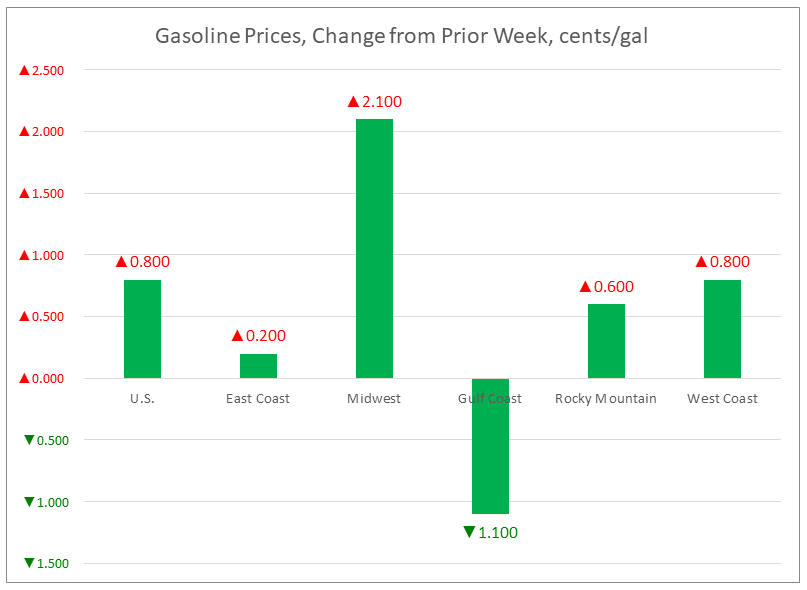 In the Midwest PADD 2 market, retail gasoline prices rose by 2.1 cents to arrive at an average price of $2.761/gallon. This was the largest price increase among the PADDs. Gasoline pump prices were 31.5 cents higher than they were one year ago.
