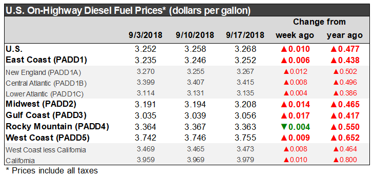 The U.S. Energy Information Administration (EIA) released its weekly data on diesel and gasoline retail prices for the week ended September 17, 2018. On a national average basis, gasoline prices rose by 0.8 cents/gallon. Diesel prices rose by 1.0 cents/gallon.