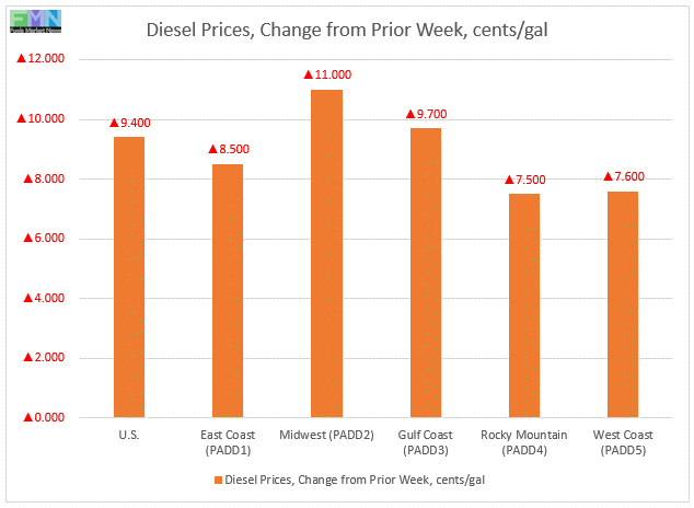 In the East Coast PADD 1, diesel prices increased by 8.5 cents to arrive at an average price of $3.083/gallon. Within PADD 1, New England prices rose by 5.7 cents to average $3.070 gallon. Central Atlantic diesel prices rose by 7.5 cents to average $3.252/gallon. Lower Atlantic prices increased by 9.7 cents to reach an average price of $2.971/gallon. PADD 1 prices were 17.1 cents/gallon below their prices for the same week last year.