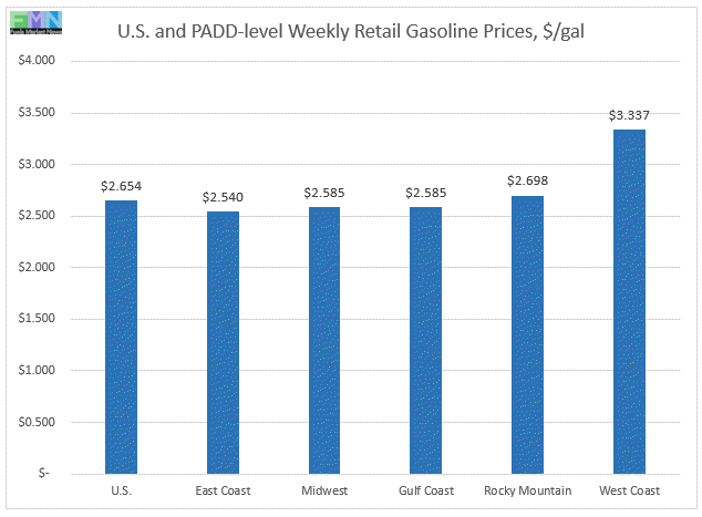 In the Rocky Mountains PADD 4 market, gasoline pump prices rose by 4.4 cents to reach an average price of $2.698/gallon. This was the smallest price increase among the PADDs. This week’s prices were 31.6 cents lower than at the same time last year.