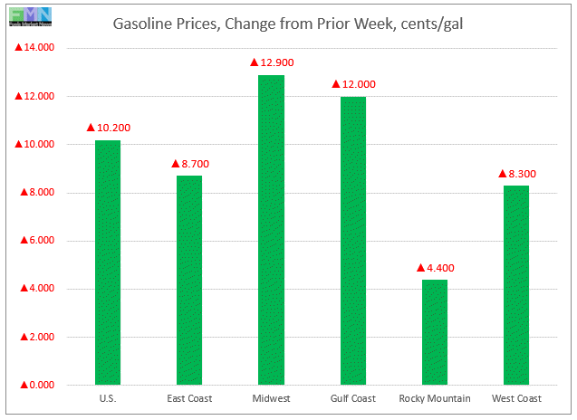 In the Midwest PADD 2 market, retail gasoline prices rose by 12.9 cents to arrive at an average price of $2.585/gallon. This was the largest price increase among the PADDs. PADD 2 prices for the current week were 20.4 cents/gallon lower than they were for the same week last year.