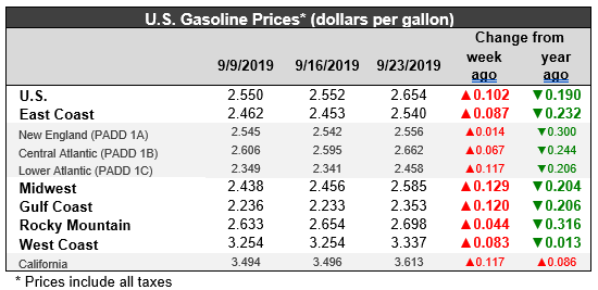 U.S. retail gasoline prices rose significantly by 10.2 cents/gallon to reach an average of $2.654/gallon during the week ended September 23. Prices rose in all PADDs and major submarkets. Retail prices for the current week were 19.0 cents per gallon lower than they were one year ago. Gasoline prices hit a peak of $2.903/gallon during the week ended October 8, 2018. Prices then slid downward for fourteen weeks in a row, shedding a total of 66.6 cents per gallon. In the next seventeen weeks, prices marched back up by 66.0 cents/gallon. Prices came very close to the peak they hit in early October, before the months of May and the June brought an easing of prices. Gasoline prices in May and June retreated by 23.3 cents per gallon. The week ended July 1st reversed that downward trend and sent prices up once again.