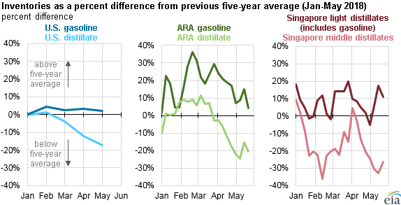 Other regions in the world have also seen higher levels of gasoline inventories and, as a result, are experiencing lower gasoline crack spreads. Major trading hubs in northwest Europe and Singapore had gasoline inventory levels higher than their previous five-year averages for most of 2018 and also have had lower gasoline crack spreads compared with recent years in April and May.