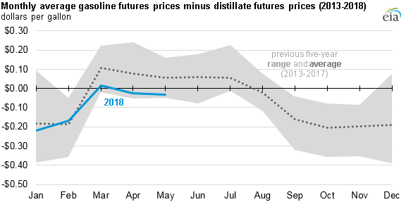 This year, however, gasoline futures prices have been lower than distillate futures prices in both April and May for the first time since 2013. The front-month futures price of reformulated blendstock for oxygenate blending (RBOB, the petroleum component of gasoline used in many parts of the country) was on average 2 cents/gal lower than the front-month futures price of ultra-low sulfur diesel (ULSD) in April. In May, the RBOB front-month price traded on average 3 cents/gal lower than the ULSD front-month price.