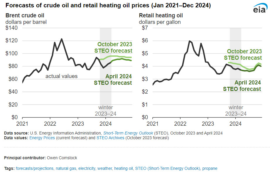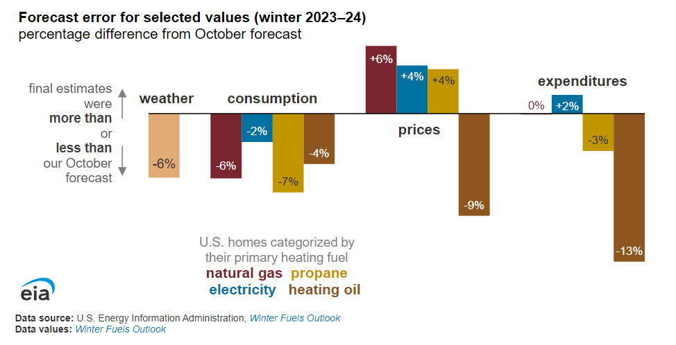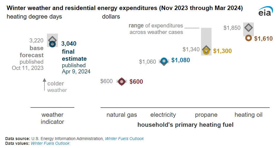 Every October, in our Winter Fuels Outlook, we publish forecasts for residential energy consumption, prices, and expenditures for the upcoming winter months. Generally, these forecasts have performed well. Our October forecasts for energy expenditures during the five-month period from November 2023 through March 2024 were within 3% of our final estimates for homes primarily heated with natural gas, electricity, and propane. Estimated energy expenditures for homes primarily heated with heating oil were 13% lower than our October forecast because of mild winter weather and lower-than-expected crude oil prices.