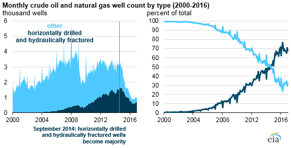 Hydraulically fractured horizontal wells have accounted for most of all new wells drilled and completed since late 2014. As of 2016, about 670,000 of the 977,000 producing wells were hydraulically fractured and horizontally drilled.
