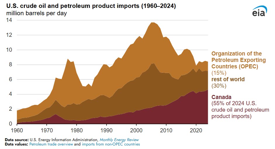 In 2006, OPEC countries, including Saudi Arabia, Algeria, and Iraq, in aggregate accounted for the largest share of U.S. crude oil and petroleum imports. Since then, imports from OPEC countries decreased 77% while imports from Canada nearly doubled. Total crude oil and petroleum imports from Canada to the United States exceeded those from OPEC for the first time in 2014 and have every year since. Following the recent expansion of Canada’s Trans Mountain pipeline, U.S. imports of crude oil from Canada reached record highs in 2024. Nearly all crude oil used by U.S. refineries in the Midwest and Mountain regions comes from Canada.