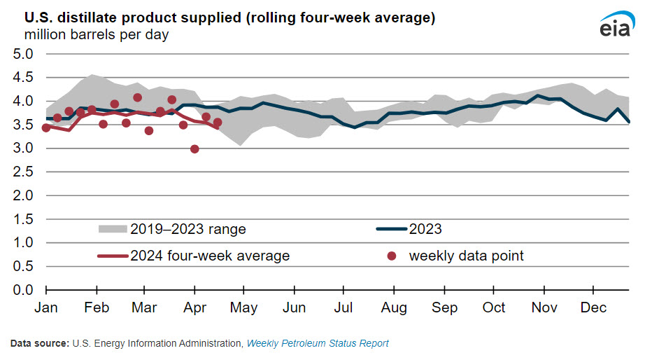 As reported in our Weekly Petroleum Status Report (WPSR), four-week average U.S. distillate consumption, which we track using product supplied, has been lower than the previous five-year (2019–23) range for most of 2024 (January 1 through April 19).