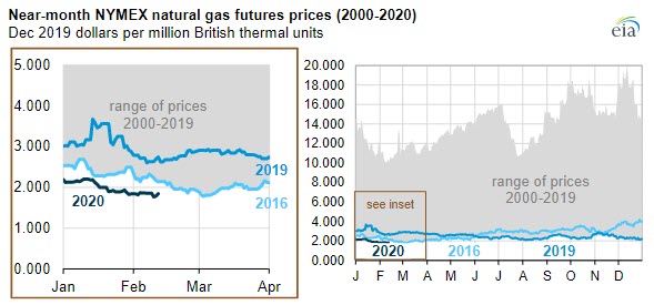 This winter, natural gas prices have been at their lowest levels in decades. On Monday, February 10, the near-month natural gas futures price at the New York Mercantile Exchange (NYMEX) closed at $1.77 per million British thermal units (MMBtu). This price was the lowest February closing price for the near-month contract since at least 2001, in real terms, and the lowest near-month futures price in any month since March 8, 2016, according to Bloomberg, L.P. and FRED data.