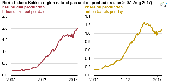 While oil production has slowed in North Dakota, natural gas production has continued to grow, reaching a record high of 1.94 billion cubic feet per day (Bcf/d) in August 2017, or the energy equivalent of about 334,000 b/d of crude oil. Despite the increasing gas-oil ratio, North Dakota still produces more than three times as much energy from crude oil as from natural gas.