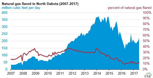 In previous years, insufficient infrastructure to collect, gather, and transport North Dakota’s increasing natural gas production meant more than 35% of the state’s gross withdrawals of natural gas was flared rather than marketed. In an effort to reduce the amount of flared gas, North Dakota’s Industrial Commission established new targets in 2014 to limit flaring to 10% by October 1, 2020. Based on data from North Dakota’s Industrial Commission, the volume of flared natural gas has declined from more than 0.35 Bcf/d in 2014 to about 0.20 Bcf/d in 2017—about a 40% decline.