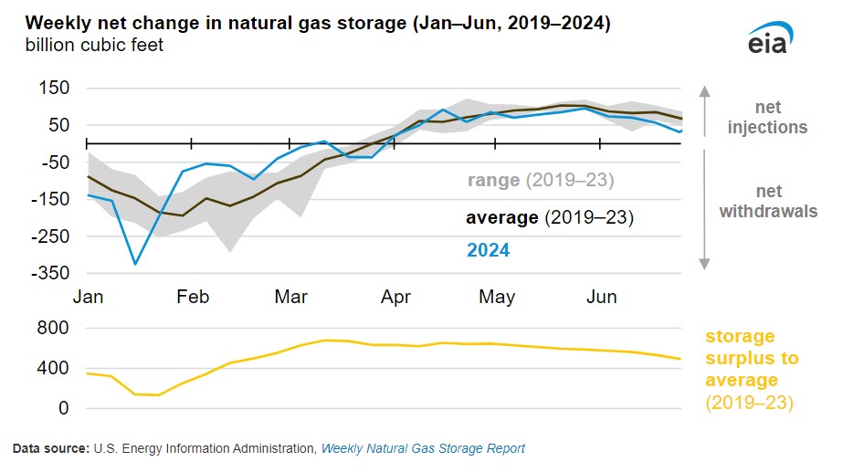 In our July STEO, we expect natural gas injections for the remainder of the injection season (July–October) will be 27% (265 Bcf) less than the five-year average, narrowing the surplus in inventory to 6% above the five-year average by the end of the injection season.