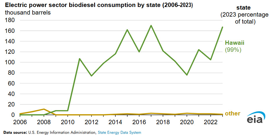 Biodiesel can also be burned to generate electricity, and the electric power sector accounted for less than 1% of U.S. biodiesel use in 2023. In 2006, a test plant in Tennessee reported the first biodiesel use for electric power in the United States. Hawaii has accounted for nearly all U.S. biodiesel consumed for electric power since 2009. In 2023, petroleum fueled about 68% of Hawaii’s total electricity generation, the highest share of any state, and we estimate that biodiesel fueled about 1% of the state’s total generation.