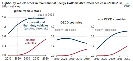 In our International Energy Outlook 2021, we estimate the global light-duty vehicle (LDV) fleet contained 1.31 billion vehicles in 2020, and we project this fleet will grow to 2.21 billion vehicles by 2050. We project electric vehicles (EVs)—any LDV with a charging plug—will grow from 0.7% of the global LDV fleet in 2020 to 31% in 2050, reaching 672 million vehicles. Significant growth in EV sales and shares of sales through the projection period results in the global conventional gasoline and diesel LDV fleet peaking in 2038.