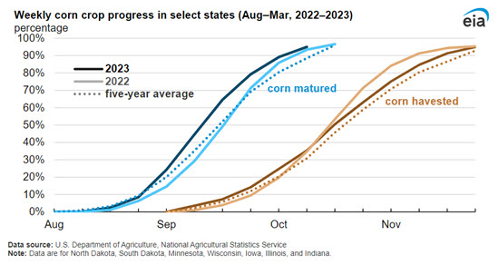 Grain-drying demand can significantly affect propane inventories in the Midwest. About 90% of the U.S. corn crop is grown in the Midwest, and if crops mature late (that is, at the end of October or later) or have a high moisture content at harvest, producers use grain dryers (primarily natural gas-fired or propane-fired) to dry the grain enough to make it marketable. However, when the corn crops reach maturity in late September or early October, producers can delay harvest to the end of October and allow the crops to dry in the field, reducing propane demand for commercial grain drying. Last year’s corn crops were planted early, leading to an earlier-than-normal harvest and less grain-drying propane demand in November 2023. As a result, Midwest propane inventories began the winter heating season near the top of the five-year range.