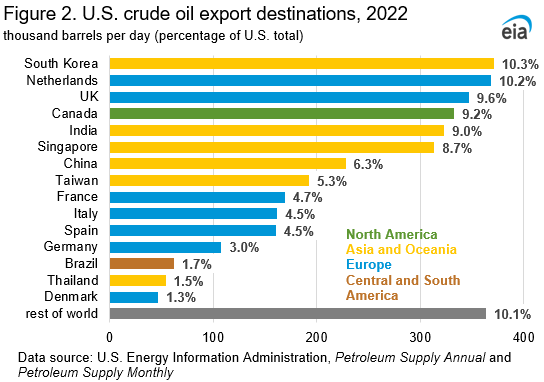 Asia and Oceania was the top regional destination for U.S. crude oil exports in 2022, representing 43% (1.55 million b/d) (Figure 2). Asia and Oceania has been the largest destination by volume for U.S. crude oil since 2017. Europe ranked second as a regional destination for U.S. crude oil exports, representing 42% (1.51 million b/d) in 2022. Europe has been the second-largest destination by volume for U.S. crude oil since 2018. Of the 15 top destinations for U.S. crude oil exports, 6 were in Asia and 7 were in Europe. Canada dropped to the fourth-largest destination for U.S. crude oil exports for the first time since the end of the U.S. crude oil export ban in 2015. Prior to 2020, Canada had been the single largest destination for U.S. crude oil exports for over 20 years, reflecting large crude oil and petroleum product trade flows between the two countries. In recent years, new U.S. crude oil production has mostly been light, low-sulfur crude oils that U.S. Gulf Coast refineries are not optimized to process. With increasing global demand for light, low-sulfur crude oils, these new barrels have increased U.S. crude oil exports to Asia and Europe.