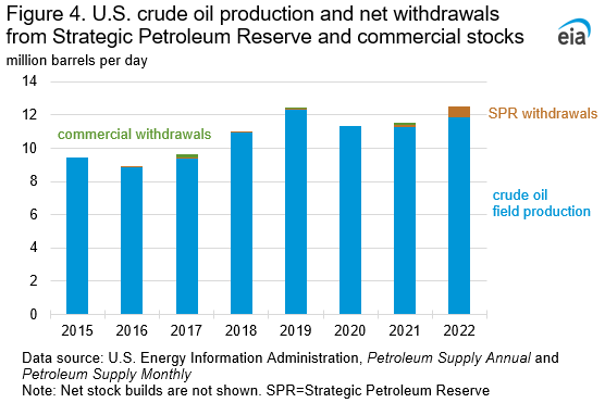 Increased U.S. crude oil production supplemented by a large withdrawal from the Strategic Petroleum Reserve (SPR) allowed for greater volumes of U.S. crude oil exports. U.S. crude oil production increased 5.6% (629,000 b/d) to 11.9 million b/d in 2022 (Figure 4). Production was 3.5% (432,000 b/d) less than the record high of 12.3 million b/d recorded in 2019. When including net stock withdrawals, however, U.S. crude oil supplied to the market surpassed 2019. U.S. crude oil production, combined with the SPR withdrawal and U.S. commercial inventory changes, reached 12.5 million b/d in 2022, 0.7% (87,000 b/d) more than the 12.4 million b/d supplied in 2019. Considering U.S. commercial crude oil inventories recorded a build of 23,000 b/d in 2022 (about 4% of the total SPR withdrawal), the SPR was a significant source of crude oil for domestic refining as well as U.S. crude oil exports. Several emergency releases from the SPR, made to temper rapidly rising crude oil prices, resulted in 222 million barrels or 607,000 b/d of additional crude oil available in the market in 2022 (nearly equal to the growth in U.S. crude oil production that year).