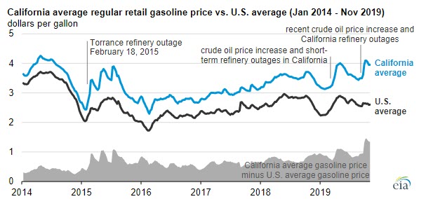 On October 7, 2019, the average California regular retail gasoline price surpassed $4 per gallon (gal) for only the second time since 2014, according to the U.S. Energy Information Administration’s (EIA) Gasoline and Diesel Fuel Update. Prices remained above $4/gal for three weeks, but prices have since fallen to $3.95/gal on October 28 and November 4.