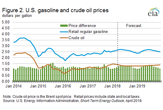 For all of 2018, EIA forecasts U.S. regular gasoline prices to average $2.64/gal. Based on this price, EIA estimates the average household will spend about $190 (4.7%) more on gasoline in 2018 than in 2017 but about $130 (2.9%) less than in 2014, when retail gasoline prices averaged higher than $3.00/gal.