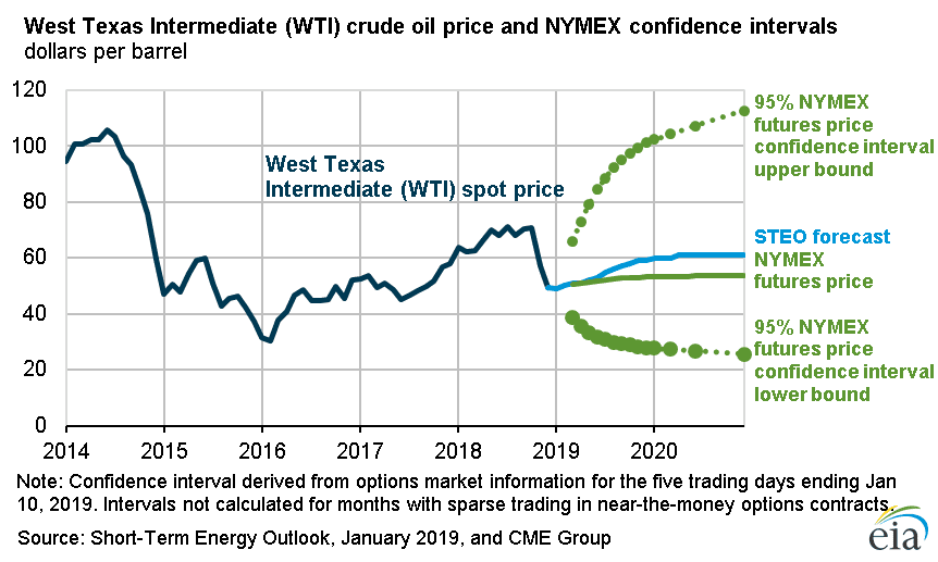 - EIA forecasts Brent prices will average $61 per barrel (b) in 2019 and $65/b in 2020. In 2018, Brent prices averaged $71/b. EIA expects West Texas Intermediate (WTI) crude oil prices will average $8/b lower than Brent prices in the first quarter of 2019 before the discount gradually falls to $4/b in the fourth quarter of 2019 and throughout 2020. EIA’s forecast for the average WTI price for December 2019 of $59/b should be considered in the context of NYMEX futures and option contract values for December 2019 delivery. NYMEX trading during the five-day period ending January 10, 2019, suggest that a range of $28/b to $101/b encompasses the market expectation for December 2019 WTI prices at the 95% confidence level.