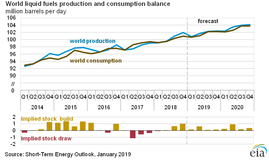 - Global liquid fuels end-of-year inventories grew by an estimated 0.4 million b/d in 2018 and EIA expects they will grow by 0.2 million b/d in 2019 and by 0.4 million b/d in 2020.