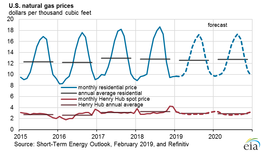 - The Henry Hub natural gas spot price averaged $3.13/million British thermal units (MMBtu) in January, down 91 cents/MMBtu from December. Despite a cold snap in late January, average temperatures for the month were milder than normal in much of the country, which contributed to lower prices. EIA expects strong growth in U.S. natural gas production to put downward pressure on prices in 2019. EIA expects Henry Hub natural gas spot prices to average $2.83/MMBtu in 2019, down 32 cents/MMBtu from the 2018 average. NYMEX futures and options contract values for May 2019 delivery traded during the five-day period ending February 7, 2019, suggest a range of $2.15/MMBtu to $3.30/MMBtu encompasses the market expectation for May 2019 Henry Hub natural gas prices at the 95% confidence level.