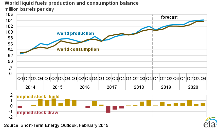 - Global liquid fuels inventories grew by an estimated 0.5 million b/d in 2018, and EIA expects they will grow by 0.4 million b/d in 2019 and by 0.6 million b/d in 2020.