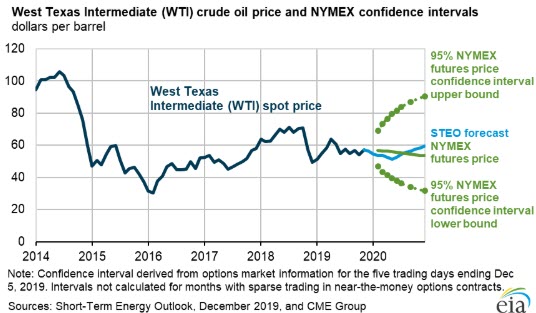- Brent crude oil spot prices averaged $63 per barrel (b) in November, up $3/b from October. EIA forecasts Brent spot prices will average $61/b in 2020, down from a 2019 average of $64/b. EIA forecasts that West Texas Intermediate (WTI) prices will average $5.50/b less than Brent prices in 2020. EIA expects crude oil prices will be lower on average in 2020 than in 2019 because of forecast rising global oil inventories, particularly in the first half of next year.