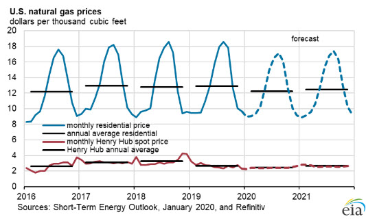 - EIA forecasts that Henry Hub natural gas spot prices will average $2.33 per million British thermal units (MMBtu) in 2020, down from $2.57/MMBtu in 2019. EIA expects that natural gas prices will then increase in 2021, reaching an annual average of $2.54/MMBtu.