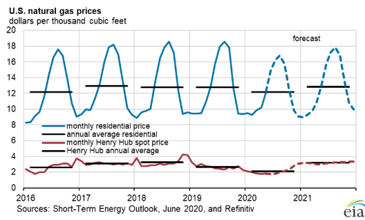 - In May, the Henry Hub natural gas spot price averaged $1.75 per million British thermal units (MMBtu). EIA forecasts that relatively low natural gas demand will keep spot prices lower than $2/MMBtu through August. However, EIA expects prices will generally rise through the end of 2021. EIA expects that natural gas price increases will be sharpest this fall and winter when they rise from an average of $2.06/MMBtu in September to $3.08/MMBtu in January. Despite EIA’s forecast of record end-of-October storage levels, EIA expects that rising demand heading into winter, combined with reduced production, will cause upward price pressures. EIA forecasts that Henry Hub natural gas spot prices will average $2.04/MMBtu in 2020 and $3.08/MMBtu in 2021.