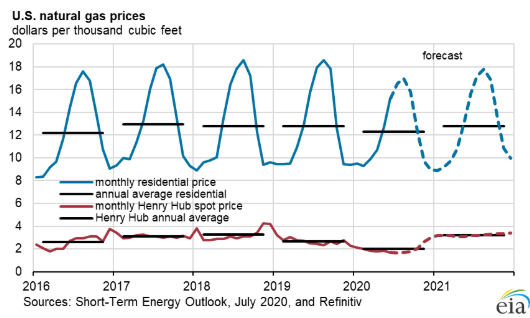 - The Henry Hub natural gas spot price averaged $1.63 per million British thermal units (MMBtu) in June, the lowest inflation-adjusted price going back to at least 1989, as a result of low demand. EIA expects falling production will put upward pressure on natural gas prices through the end of 2021. EIA forecasts that Henry Hub spot prices will average $1.93/MMBtu in 2020 and $3.10/MMBtu in 2021.