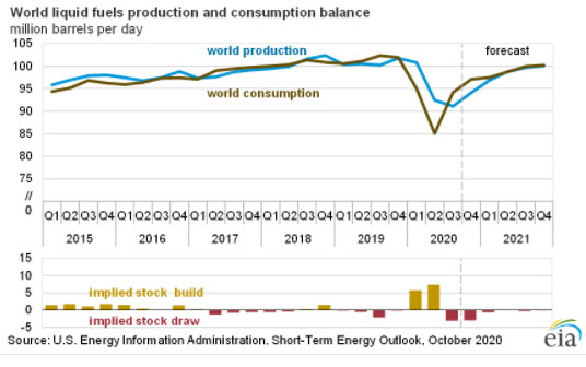 - The October Short-Term Energy Outlook (STEO) remains subject to heightened levels of uncertainty because mitigation and reopening efforts related to COVID-19 continue to evolve. Reduced economic activity related to the COVID-19 pandemic has caused changes in energy demand and supply patterns in 2020 and will continue to affect these patterns in the future. This STEO assumes U.S. gross domestic product (GDP) declined by 4.4% in the first half of 2020 from the same period a year ago. It assumes that GDP will rise beginning in the third quarter of 2020, and will grow 3.5% year-over-year in 2021. The U.S. macroeconomic assumptions in this outlook are based on forecasts by IHS Markit.