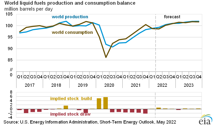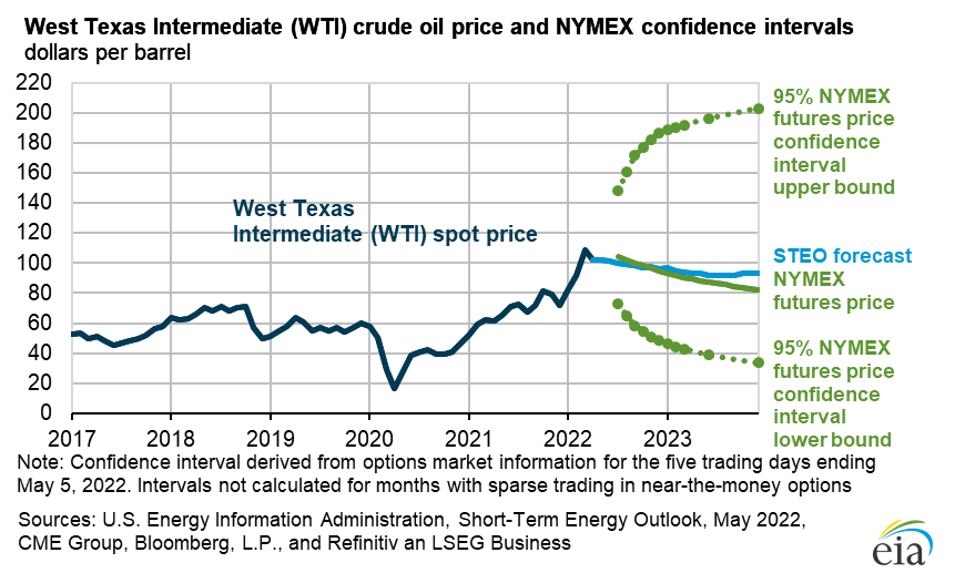 - The May Short-Term Energy Outlook (STEO) is subject to heightened levels of uncertainty resulting from a variety of factors, including Russia’s full-scale invasion of Ukraine. This STEO assumes U.S. GDP will grow by 3.1% in both 2022 and 2023, following growth of 5.7% in 2021. We use the S&P Global macroeconomic model to generate our U.S. economic assumptions. Global macroeconomic assumptions in our forecast are from Oxford Economics and include global GDP growth of 3.4% in 2022 and 3.5% in 2023, compared with growth of 6.0% in 2021. A wide range of potential macroeconomic outcomes could significantly affect energy markets during the forecast period. Major factors driving energy supply uncertainty include how sanctions affect Russia’s oil production, the production decisions of OPEC+, and the rate at which U.S. oil and natural gas producers increase drilling.