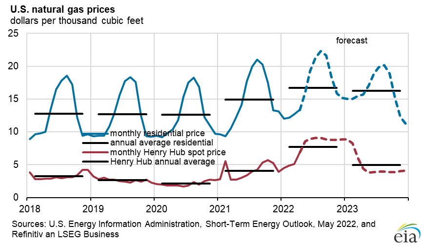 - In April, the Henry Hub natural gas spot price averaged $6.59 per million British thermal units (MMBtu), which was up from the March average of $4.90/MMBtu and higher than the April 2021 average of $2.66/MMBtu. We expect the Henry Hub price to average $7.83/MMBtu in 2Q22 and average $8.59/MMBtu in 2H22. High forecast natural gas prices reflect our expectation that natural gas storage levels will remain less than the five-year (2017–2021) average this summer. Lower-than-average storage levels partly result from limited opportunities for natural gas-to-coal switching for power generation, which we forecast will keep the demand for natural gas for power generation high despite high prices. Natural gas prices could rise significantly above forecast levels if summer temperatures are hotter than assumed in this forecast and electricity demand is higher. In addition, we expect that U.S. liquefied natural gas exports (LNG) will remain high during the summer. We expect the Henry Hub spot price will average $4.74/MMBtu in 2023. The forecast drop in prices for 2023 reflects our expectation that the rate of natural gas production will increase next year while LNG export and demand growth slow, contributing to higher storage levels in 2023 than in 2022.