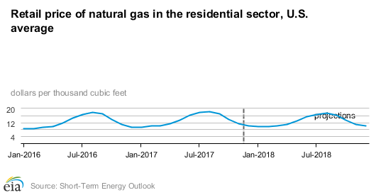 - In November, the U.S. benchmark Henry Hub natural gas spot price averaged $3.01 per million British thermal units (MMBtu), up nearly 14 cents/MMBtu from October. Expected growth in natural gas exports and domestic natural gas consumption in 2018 contribute to an increase in EIA’s forecast Henry Hub natural gas spot price from an annual average of $3.01/MMBtu in 2017 to $3.12/MMBtu in 2018. NYMEX contract values for March 2018 delivery that traded during the five-day period ending December 7, 2017, suggest that a range of $1.98/MMBtu to $4.27/MMBtu encompasses the market expectation for March Henry Hub natural gas prices at the 95% confidence level.