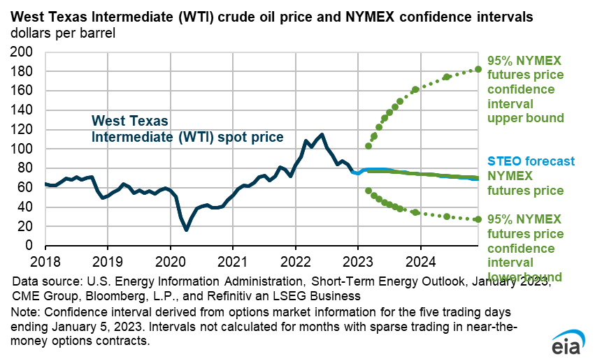 - Crude oil prices. We forecast that the Brent crude oil price will average $83 per barrel (b) in 2023, down 18% from 2022, and continue to fall to $78/b in 2024 as global oil inventories build, putting downward pressure on crude oil prices.