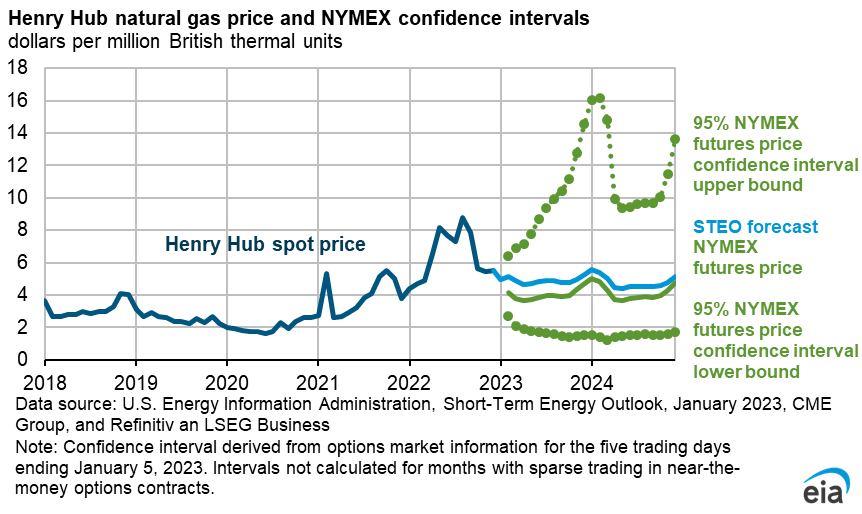- Natural gas prices. The Henry Hub natural gas spot price averages slightly less than $5.00 per million British thermal units (MMBtu) in 2023 in our forecast—down close to 25% from last year—as domestic consumption declines and liquefied natural gas (LNG) exports remain relatively flat. In 2024, we expect natural gas prices to again average slightly below $5.00/MMBtu, as dry natural gas production outpaces an increase in LNG exports that results from rising LNG export capacity.