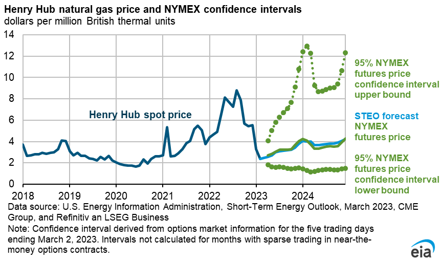 - Natural gas inventories and price. As a result of less natural gas consumption than we had expected, we forecast that the United States will close the withdrawal season at the end of March with more than 1.9 trillion cubic feet of natural gas in storage, 23% more than the five-year average and 27% more than we forecast in the January STEO. The Henry Hub natural gas spot price in our forecast averages about $3 per million British thermal units (MMBtu) in 2023, down by more than 50% from last year. We had expected almost $5/MMBtu in the January STEO forecast.