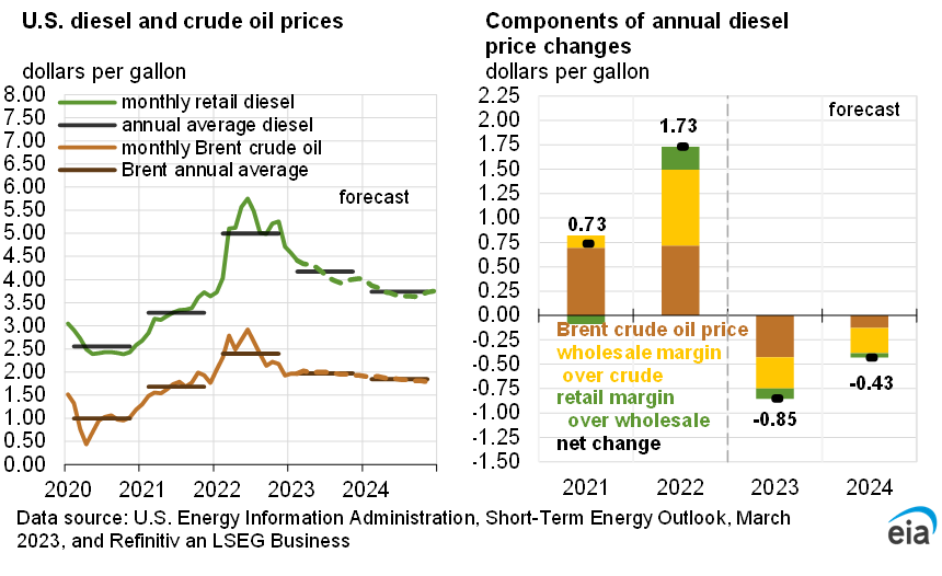 - Global Liquid fuels consumption. We expect global liquid fuels consumption to increase by 1.5 million barrels per day (b/d) in 2023 from 2022 and by an additional 1.8 million b/d in 2024. China is the main driver of growth in 2023 as the country shifts away from its zero-COVID policy, a shift that will increase travel. Growth in 2024 is more evenly distributed among countries as global GDP growth accelerates from 2.0% in 2023 to 3.2% in 2024.
