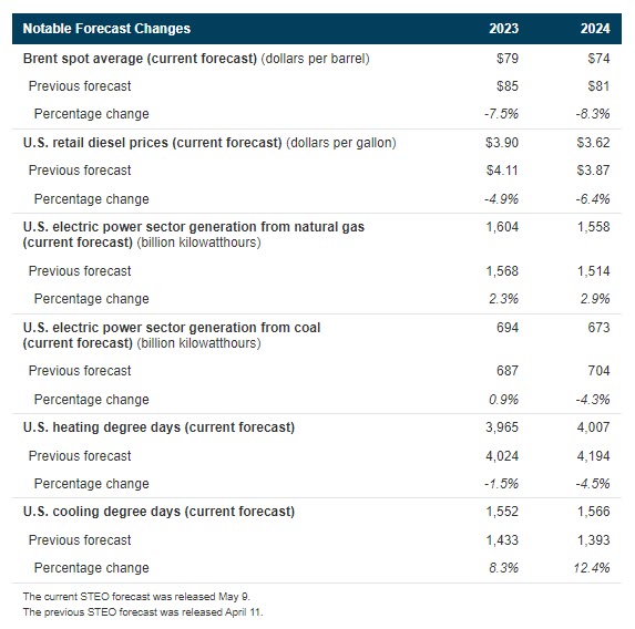 - Weather forecast. Beginning with the May 2023 Short-Term Energy Outlook (STEO), our STEO model will combine a 30-year trendline and the National Oceanic and Atmospheric Administration’s forecast to create our weather forecasts. This methodology change will result in warmer forecast weather in the United States in both the winter and in the summer. The change will involve a one-time shift that will decrease our heating degree day (HDD) forcast in 2023 by 1% and in 2024 by 4%, and increase our cooling degree day (CDD) forecast by 8% in 2023 and by 12% in 2024. The shift will affect some series that use weather as an independent variable.