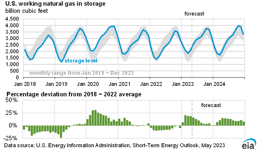 - Natural gas consumption. We forecast the second most U.S. natural gas consumption for electricity generation on record this summer (May–September), behind last year, and averaging about 38 billion cubic feet per day (Bcf/d). Compared with last month’s forecast, we have increased natural gas consumption for electricity generation by about 2% for 2023 and 3% for 2024 because of our methodology change which results in more CDDs, and in more U.S. electricity generation during the summer.